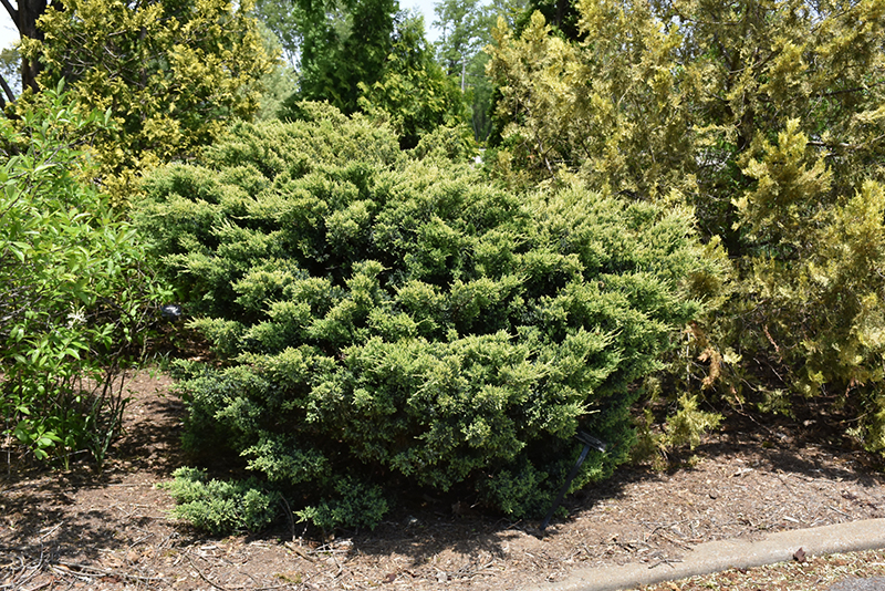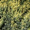 A most beautiful groundcover juniper, featuring bright yellow new growth over bluish-green fine-textured foliage; compact, mounded, with arching branch tips that spread out; superb for massing or as a color accent groundcover